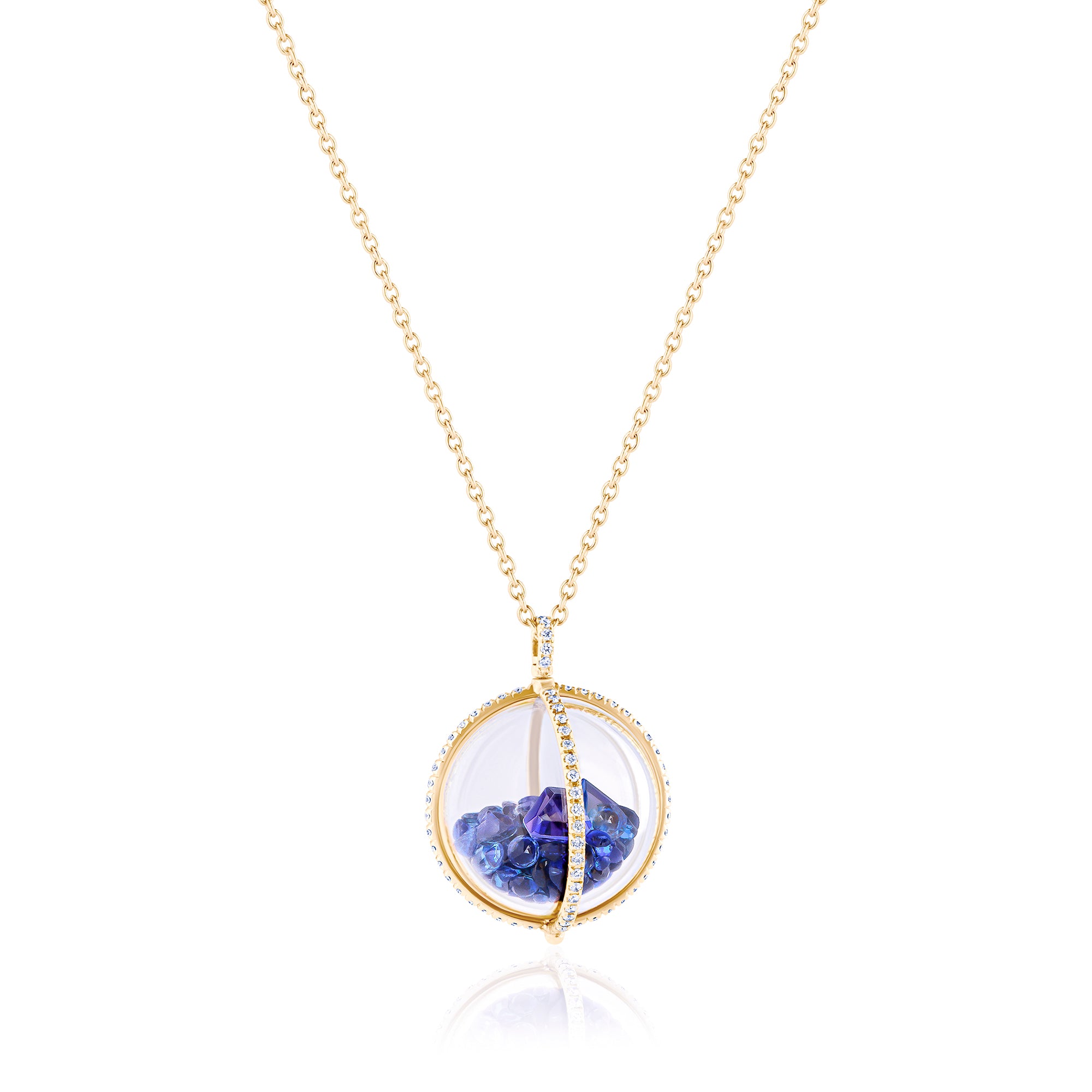 The Globe 20 Necklace Blue in 18 karat gold features an adjustable chain that centers a sphere-shaped Kaleidoscope Shaker™ filled with loose blue sapphires and tanzanite. To preserve this piece, consult the care instructions.