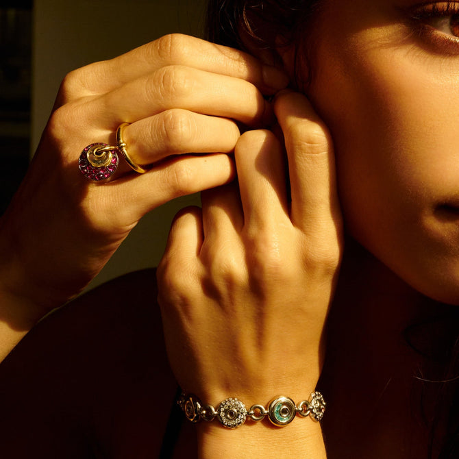 Kaleidoscope Shaker™ rings and bracelets are water-resistant, but we do recommend them to be kept away from water as much as possible. Necklaces and earrings are NOT water-resistant. Keep them away from water and other liquids at all times. Do not shower or swim with your jewels. Use a soft dry cloth to remove fingerprints and dust from the crystal panes when necessary. Do not machine polish or apply fire. Do not use ultrasonic or steam cleaners.